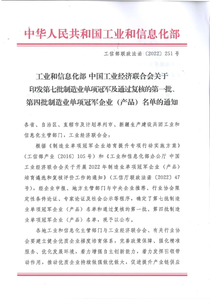 日前,工業(yè)和信息化部、中國工業(yè)經(jīng)濟(jì)聯(lián)合會發(fā)布了《關(guān)于印發(fā)第七批制造業(yè)單項冠軍及通過復(fù)核的第一