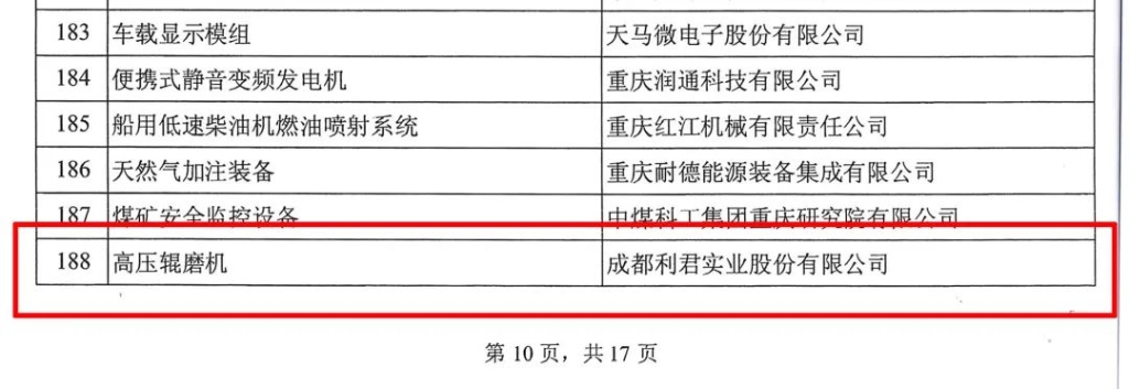 批、第四批制造業(yè)單項冠軍企業(yè)(產(chǎn)品)名單的通知》,成都利君實業(yè)股份有限公司(以下簡稱“公司”)產(chǎn)品“高壓輥磨機(jī)”入選為第七批制造業(yè)單項冠軍產(chǎn)品